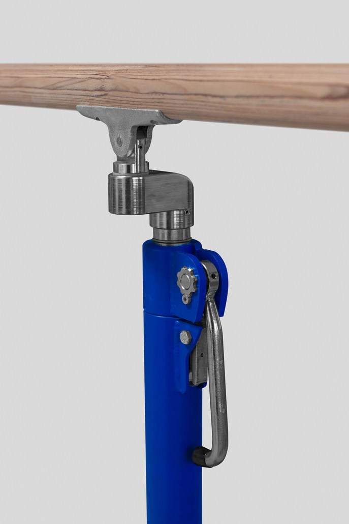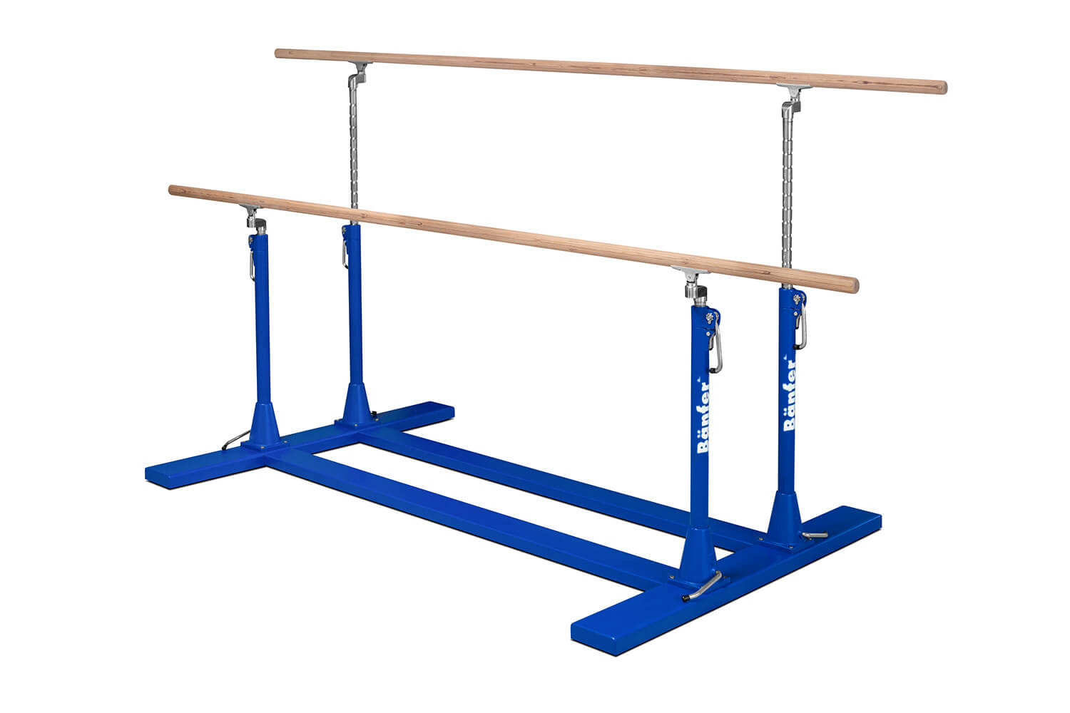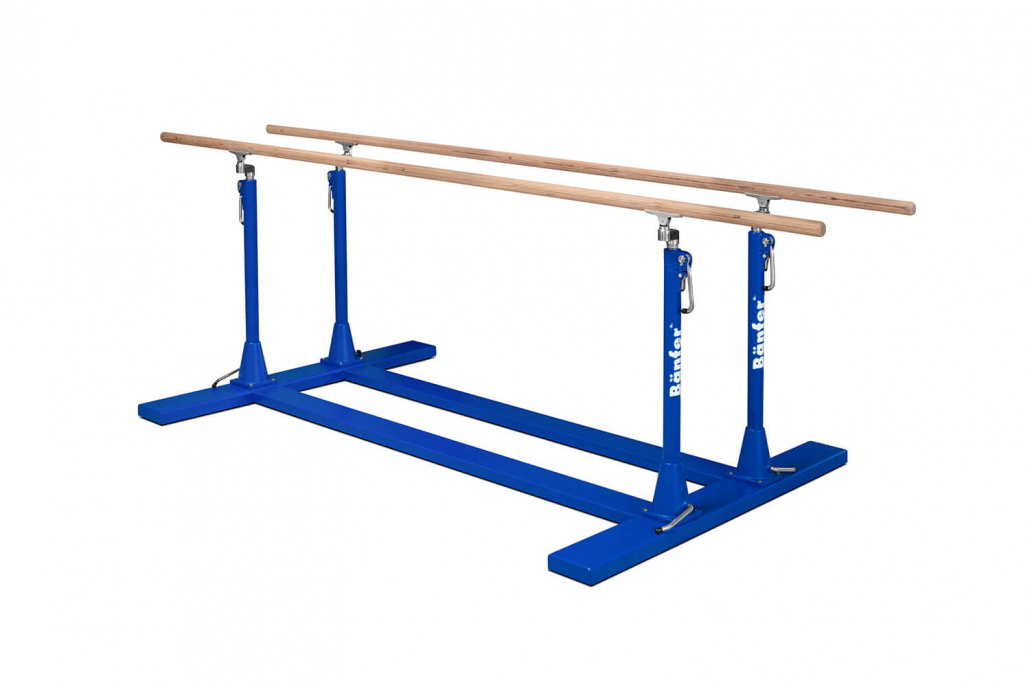 Äußerst stabile Stahlkonstruktion. Aufstandflächen mit nichtfärbenden Fußgummis. Die Barrensäulen verfügen über eine Höhenverstellung in 50 mm Schritten von 1100 bis 1700 mm mit speziell bedienfreundlicher und äußerst sicherer Klemmvorrichtung. Breitenverstellung von 410 bis 570 mm. Holmlänge 3500 mm.