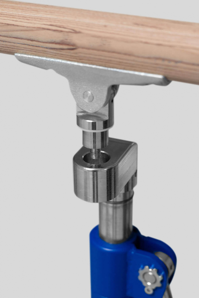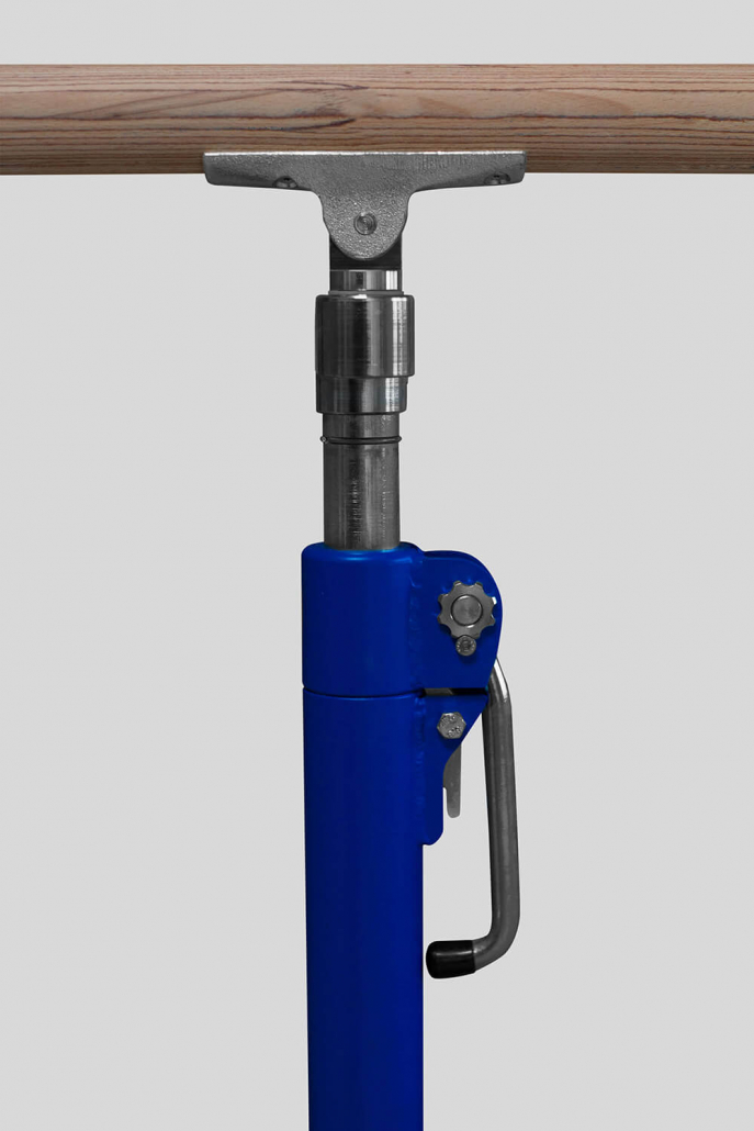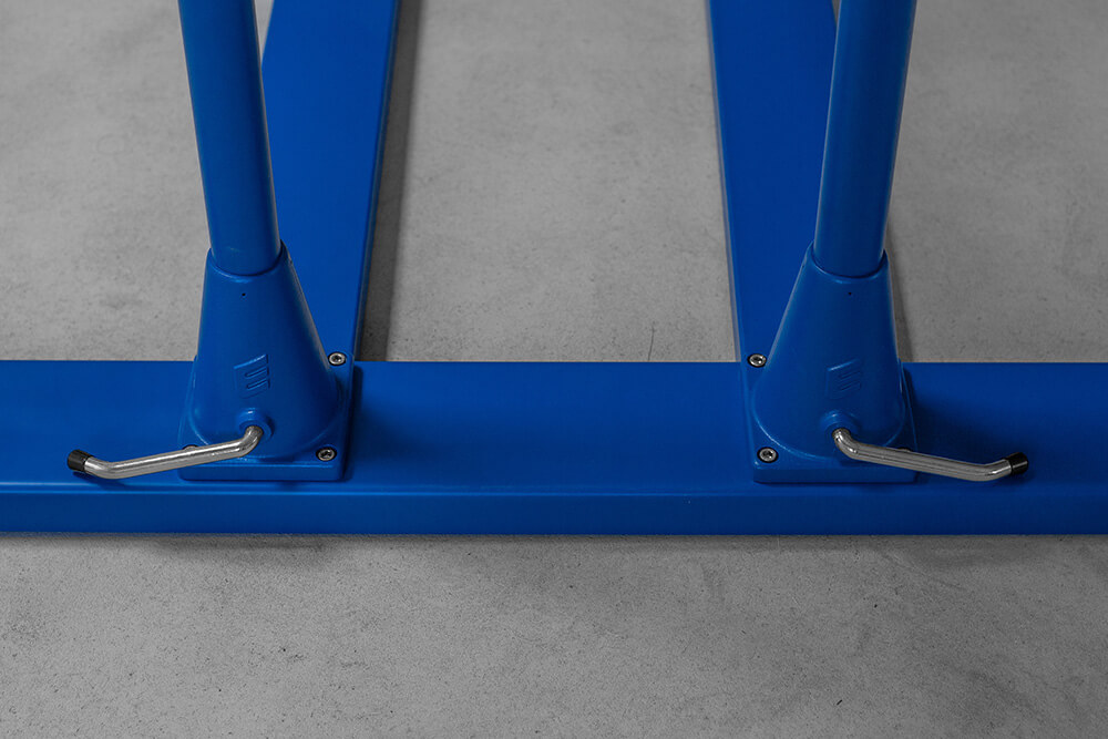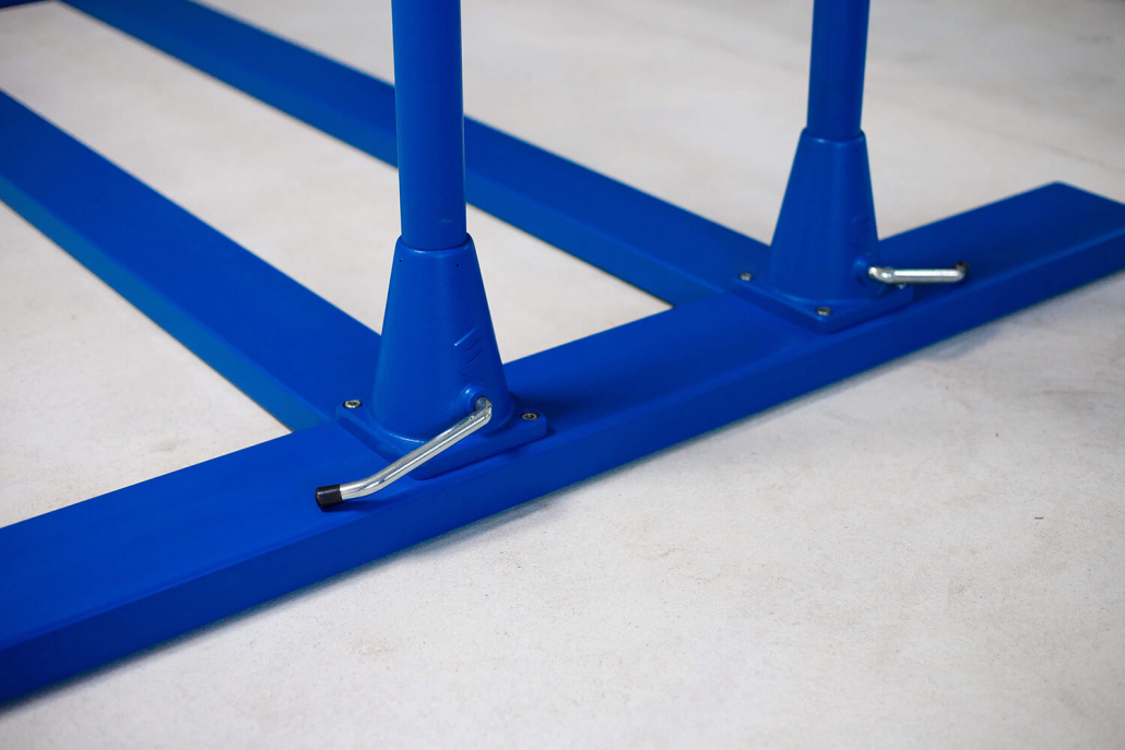 Extremely sturdy steel construction. Base construction with non-staining foot rubber attachments. The bar columns are height-adjustable in 50 mm steps from 1100 to 1700 mm with special operation-friendly and extremely safe clamping devices. Width adjustment from 410 to 570 mm. Frame member length 3500 mm.