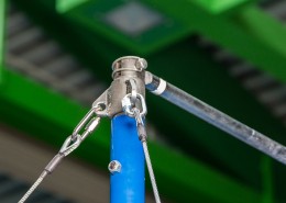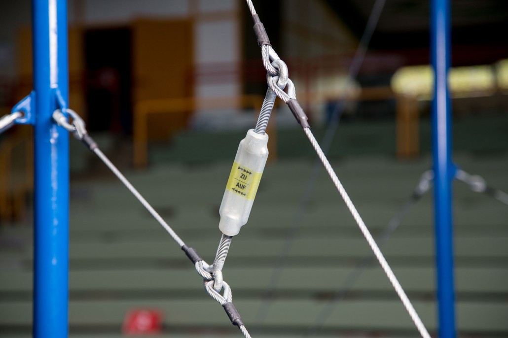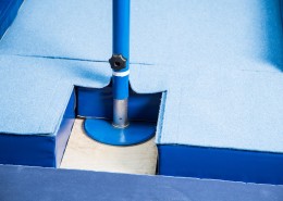 Als Zubehör erhältliche Druckverteilerplatten garantieren extrem hohe Standsicherheit auch auf punkt- und flächenelastischen Sporthallenböden. Reckstange aus massivem rostbeständigen Federstahl, die im Recksäulenkopf lagert.