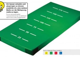 Wer kann am weitesten springen? Und wie weit ist das Kind gesprungen? Hier die Antwort. Auf der Turnmatte ist eine Größenskala aufgebracht. So kann diese Turnmatte super als Wettkampfmatte oder Spielmatte in vielen anderen Bereichen verwendet werden.
